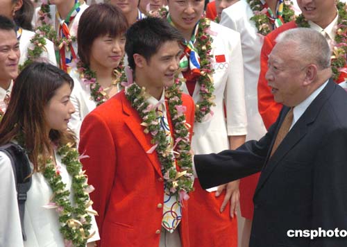 由袁偉民任團長的中國奧運金牌代表團一行共有68人,包括了在雅典榮獲32枚金牌的全部運動員和許海峰、陳忠和等7位著名教練。
