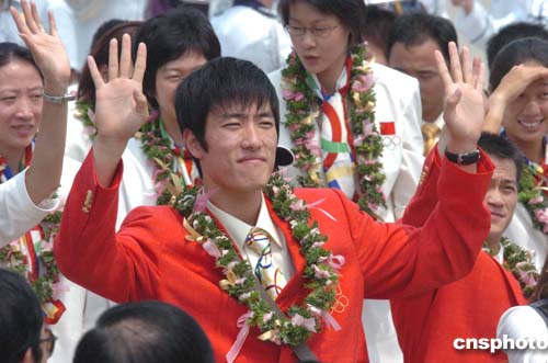 代表團在十一時十五分左右由袁偉民帶領(lǐng)下走出機艙,緊隨其后的是奧運一百一十米跨欄金牌得主劉翔、跳水公主郭晶晶、跳水王子田亮、“蛙后”羅雪娟等廣受香港市民歡迎的運動員。男運動員身穿整齊和耀目的西裝,女運動員則身著大方得體的外套和裙子,他們頸上掛著花環(huán),顯得精神抖擻,不斷向在場歡迎人士露出燦爛的笑容并揮手致意。