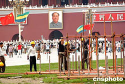 北京市政工人九月五日開始在天安門廣場搭建腳手架,準(zhǔn)備建立組裝國慶節(jié)的大型花壇,迎接中華人民共和國成立55周年。中新社記者:鄒憲
