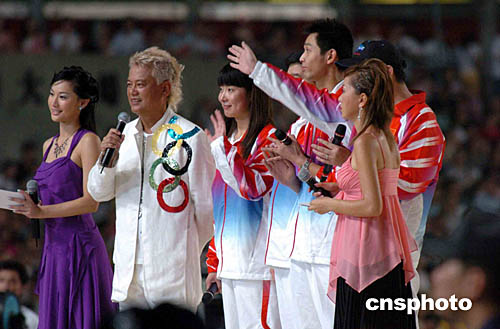 “奧運金牌精英大匯演”7日晚上在香港政府大球場舉行,全場爆滿。圖為香港藝人陳百祥(左二)任大匯演的司儀。作者:洪少葵