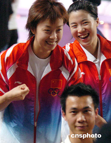 為歡迎國(guó)家奧運(yùn)金牌代表團(tuán)訪港,九月七日香港舉行“金牌精英大匯演”,圖為奧運(yùn)乒乓球金牌得主張怡寧、王楠興高采烈在“大匯演”上。中新社記者:錢興強(qiáng)