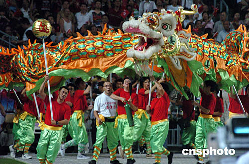 為歡迎國(guó)家?jiàn)W運(yùn)金牌代表團(tuán)訪港,九月七日香港舉行“金牌精英大匯演”,圖為“大匯演”上巨龍飛舞。中新社記者:錢興強(qiáng)