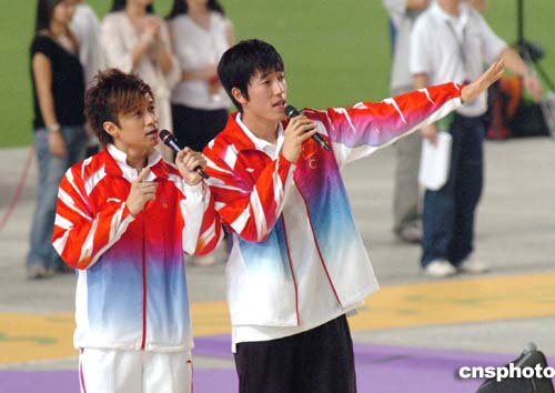 射擊金牌得主杜麗、王義夫、朱啟南及賈占波則表演射擊,四人分別輕松地?fù)糁小爸小、“?guó)”、“第”、“一”四字,贏得現(xiàn)場(chǎng)喝采聲。舉重金牌得主陳艷青、劉春紅、石智勇及張國(guó)政則與武術(shù)隊(duì)表演拔河,最終亦以“大熱”姿態(tài)勝出。