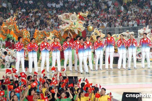 9月7日晚上,位于快活谷的香港大球場成為名副其實的“歡樂之谷”,國家奧運金牌選手和數(shù)萬名香港市民會聚在此,共享中國在雅典奧運會奪金的喜悅和榮光。“奧運精英大匯演”在這里拉開帷幕。圖為女排教練陳忠和帶領全體選手高歌,為晚會推向高潮。作者:洪少葵