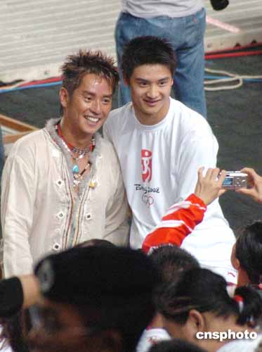 萬(wàn)眾矚目的“奧運(yùn)精英大匯演”7日晚上在香港大球場(chǎng)舉行,國(guó)家?jiàn)W運(yùn)金牌選手和數(shù)萬(wàn)名香港市民會(huì)聚在此,共享中國(guó)在雅典奧運(yùn)會(huì)奪金的喜悅和榮光。圖為金牌選手田亮邀請(qǐng)演出嘉賓譚詠麟合影。作者:洪少葵