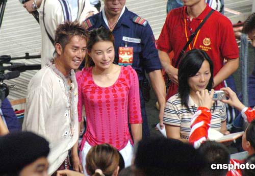 萬眾矚目的“奧運(yùn)精英大匯演”7日晚上在香港大球場舉行,國家奧運(yùn)金牌選手和數(shù)萬名香港市民會(huì)聚在此,共享中國在雅典奧運(yùn)會(huì)奪金的喜悅和榮光。圖為金牌選手郭晶晶邀請譚詠麟合影。作者:洪少葵