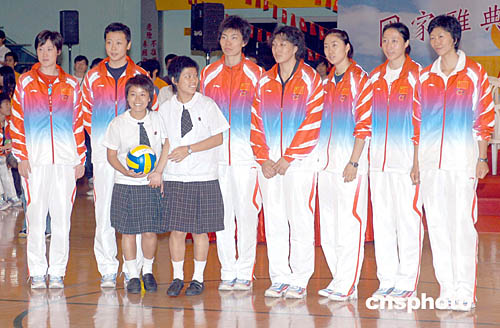 國(guó)家?jiàn)W運(yùn)金牌代表團(tuán)9月8日在香港與中學(xué)生運(yùn)動(dòng)交流,并舉行抽獎(jiǎng)活動(dòng),中國(guó)女排部份隊(duì)員向獲獎(jiǎng)學(xué)生致送簽名排球及合照。作者:鄧慶樂(lè)