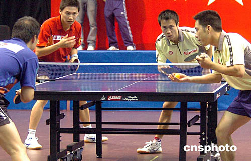為歡迎國家奧運(yùn)金牌代表團(tuán)訪港,九月八日香港舉行“中國人的驕傲--奧運(yùn)金牌精英顯風(fēng)采”奧運(yùn)金牌羽毛球及乒乓球表演。圖為奧運(yùn)乒乓球男子雙打金牌得主馬林、陳杞與銀牌得主香港的李靜、高禮澤進(jìn)行混合友誼賽。中新社記者:錢興強(qiáng)