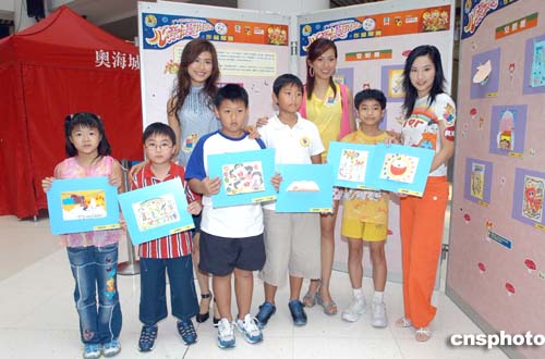應屆港姐徐子珊、朱慧敏及符思思9月11日在香港出席TVB兒童節(jié)心意卡及短文比賽頒獎典禮。三位港姐與TVB兒童節(jié)心意卡設計獲獎的小朋友合照。作者:鄧慶樂