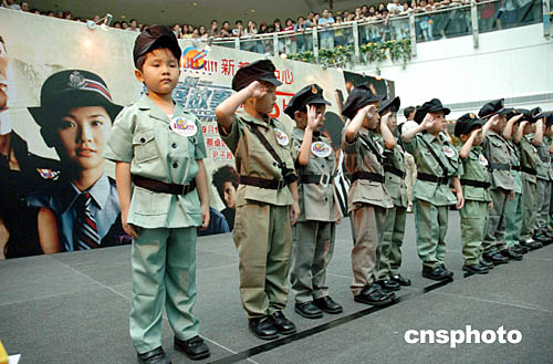 成龍作品《新警察故事》即將在香港上映,9月12日劇中一眾演員在將軍澳新都城天幕廣場(chǎng)舉辦的“新警察故事-激斗Show”上與觀眾游戲同樂。圖為十位小警察步操出場(chǎng)為活動(dòng)拉開序幕。作者:洪少葵