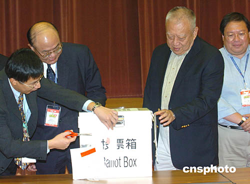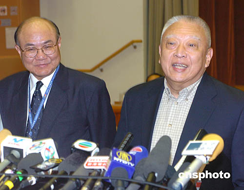 行政長官董建華與選舉管理委員會(huì)主席胡國興﹑民政事務(wù)局局長何志平12日晚到位于跑馬地黃泥涌道禮頓山社區(qū)會(huì)堂點(diǎn)票開箱點(diǎn)票。