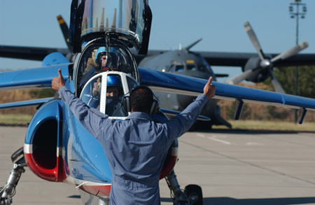 法國空軍的“法蘭西巡邏兵”飛行表演隊(duì)正式成立于1964年2月。飛行表演隊(duì)的飛機(jī)涂著同法國國旗一樣的紅、白、藍(lán)三種顏色,機(jī)群在空中做飛行表演時(shí)也常常把著三種顏色的煙跡留在空中。它象征著“自由”(紅色)、“民主”(白色)、“博愛”(藍(lán)色),體現(xiàn)了法國人民勇敢、浪漫的傳統(tǒng)和對未來美好的愿望。圖為在地勤人員指示下飛行員把飛機(jī)駛到指定位置(來源:艦船知識(shí)網(wǎng)絡(luò)版)