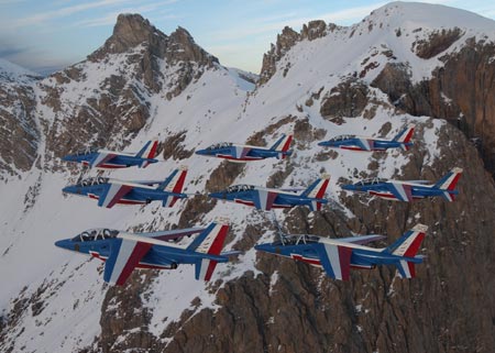 法國空軍的“法蘭西巡邏兵”飛行表演隊(duì)正式成立于1964年2月。飛行表演隊(duì)的飛機(jī)涂著同法國國旗一樣的紅、白、藍(lán)三種顏色,機(jī)群在空中做飛行表演時(shí)也常常把著三種顏色的煙跡留在空中。它象征著“自由”(紅色)、“民主”(白色)、“博愛”(藍(lán)色),體現(xiàn)了法國人民勇敢、浪漫的傳統(tǒng)和對未來美好的愿望。圖為8機(jī)正方形編隊(duì)(來源:艦船知識(shí)網(wǎng)絡(luò)版)