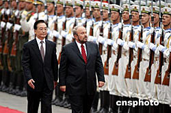 中國國務(wù)院總理溫家寶九月十三日下午在北京人民大會(huì)堂東門外廣場(chǎng)主持儀式,歡迎來訪的阿爾巴尼亞總理納諾。這是中阿總理三十八年來的首次會(huì)晤。中新社記者:毛建軍