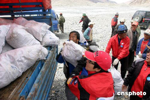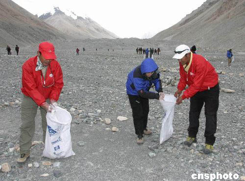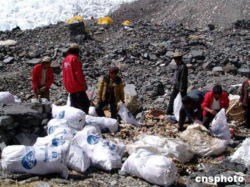 “2004地球第三極珠峰環(huán)保大行動(dòng)”在珠峰展開清掃工作。作者:范曉麗