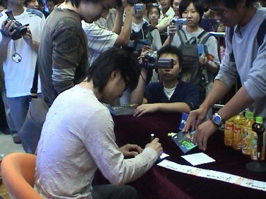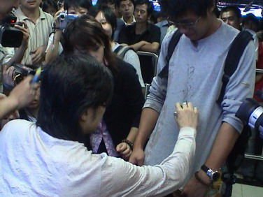 當(dāng)彭坦小心翼翼的剛把腳邁出休息室走向簽售區(qū)那一刻時(shí),還是被明眼的歌迷發(fā)現(xiàn)。“天啊,彭坦在那!”于是達(dá)達(dá)樂隊(duì)4個(gè)人基本上是飛快跑到簽售臺的,四個(gè)帥小伙的出現(xiàn)引起了現(xiàn)場不小的騷亂。人群涌動(dòng),好多小女生興奮異常。
