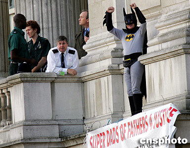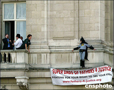 這名抗議者詹森·哈奇,今年32歲,是英國(guó)維護(hù)父權(quán)組織“為父親討公道(Fathers 4 Justice)”的一名成員,他扮成蝙蝠俠模樣,闖入女王伊麗莎白二世居住的白金漢宮,爬上宮殿正面一個(gè)陽(yáng)臺(tái),又從陽(yáng)臺(tái)走到危險(xiǎn)的墻檐上,引來(lái)大群圍觀者。大為尷尬的白金漢宮安全官員當(dāng)天晚上即對(duì)此事展開調(diào)查。
