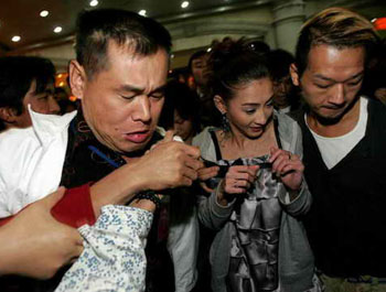 聽說張美人終于要下樓了,門口一片沸騰,當(dāng)張柏芝在幾位隨從人員的簇?fù)硐鲁鰣鰰r,現(xiàn)場炸開了鍋,尖叫聲一浪高過一浪。大家的雙臂熱情地伸向張柏芝,快到門口時,張柏芝身邊一位助手更是把她緊緊摟在懷里,剛到門口,立刻伸過來3只手向張柏芝胸口“進(jìn)軍”,大美女被嚇得花容失色,一位伸手企圖和張柏芝親密接觸的男子更是笑得比花還燦爛。