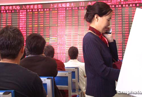 受利好消息的良性影響,九月二十日(周一),中國滬深股市大盤呈現(xiàn)出放量上漲的滿堂紅景觀。該日,北京股民神態(tài)自若地在證券營業(yè)部內(nèi)進(jìn)行交易。當(dāng)日兩市共成交約419億,比上一個交易日明顯放大。其中上證指數(shù)漲跌幅達(dá)+3.43%;上證B股指數(shù)漲跌幅達(dá)3.46%;深證成指漲跌幅達(dá)3.76%;深證成份B指漲跌幅達(dá)4.07%。中新社記者:鄒憲