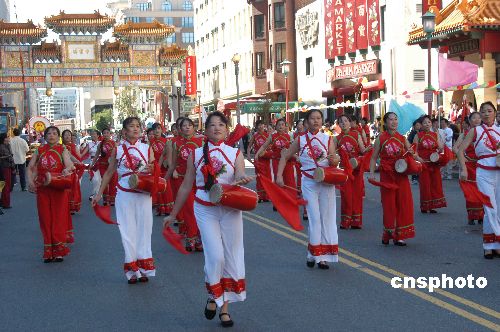 二零零四年華盛頓中國(guó)文化節(jié)九月十九日在華盛頓唐人街舉行。身著民族服飾的東方女子敲起腰鼓,別有風(fēng)韻。 作者:余東暉