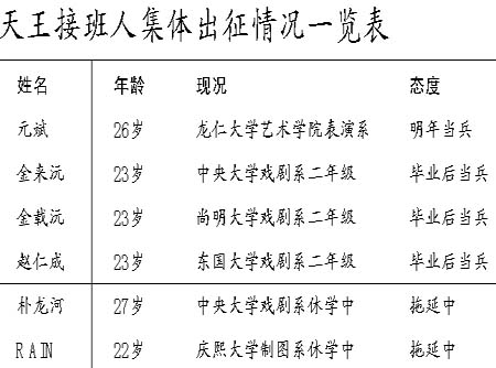 正當(dāng)宋承憲、張赫、韓在石“非法逃兵役”事件受到各界關(guān)注時(shí),還沒當(dāng)兵的天王接班人元斌、金來沅、金載沅、趙仁成、RAIN即將面臨同樣的問題,可以想像的是,他們會(huì)記取前車之鑒而不敢造次。韓國男星沒當(dāng)兵的人實(shí)在太多,許多小天王為了自己大好演藝事業(yè),不敢面對現(xiàn)實(shí),一再以休學(xué)來拖延當(dāng)兵,年紀(jì)都二十郎當(dāng)了,還在念大一、大二,不然就像樸龍河一樣到了27歲還沒畢業(yè)去當(dāng)兵。