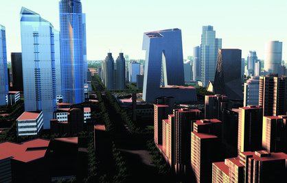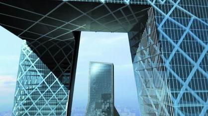 CCTV主樓的兩個塔樓從一個共同的平臺升起,在上部匯合,形成三維體驗,突破了摩天樓常規(guī)的豎向特征的表現(xiàn)。復雜的功能包容在內(nèi)部緊密連接的環(huán)路中,體現(xiàn)一個相互合作、相互依存的鏈條以及自身組織的有序和協(xié)調(diào)。