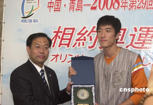 二十二日下午抵達二00四國際田聯(lián)全明星賽橫濱賽之前,匆匆途經(jīng)正在橫濱中華街內(nèi)舉行的“揚帆青島、相約奧運”巡回展展場,為其熱情助陣。圖為劉翔在現(xiàn)場接受二00八年奧運會帆船比賽賽地青島市贈送的比賽紀念牌。 作者:王健