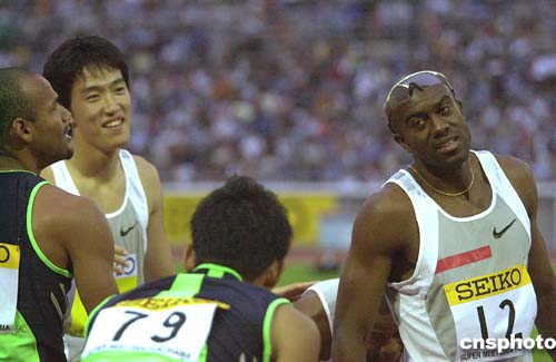 劉翔在二十三日傍晚于日本橫濱國際體育場進(jìn)行的國際田聯(lián)全明星賽男子一百一十米欄比賽中疲憊出戰(zhàn),仍然輕松地將他的前輩老對手阿蘭·約翰遜拋到身后,令賽前揚(yáng)言要破紀(jì)錄并戰(zhàn)勝劉翔的約翰遜無話可說。圖為兩位新老名將沖線后都是一臉笑容,但顯然,劉翔笑得愉快,約翰遜笑得無奈。中新社記者:王健