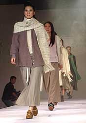 九月二十三日晚,香港時(shí)裝設(shè)計(jì)師吳美儀以簡約大氣,洋溢陸歐風(fēng)情的時(shí)裝作品在2004青島國際時(shí)裝周上亮相。作者:史利