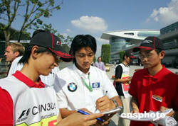 參加F1中國大獎賽和其他輔助賽的車手,九月二十四日在上海國際賽車場開始練習(xí)。圖為華裔車手董荷斌為車迷簽名。作者:潘索菲