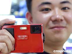 當(dāng)“法拉利F1”賽車即將在上;鸨菆鰰r,一款大紅色數(shù)碼相機也首次在北京中關(guān)村亮相,這是法拉利與奧林巴斯合作生產(chǎn)的民用數(shù)碼相機,全球限量發(fā)行一萬臺,其中北京配額500臺。作者:韓藝冰