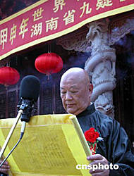 當(dāng)所有海內(nèi)外舜裔宗親和當(dāng)?shù)厝罕娨黄鹣蛩吹坌型耆瞎Y后,來自香港的世界舜裔宗親聯(lián)誼會(huì)主席、主祭人陳守仁先生和湖南省九嶷山舜帝陵基金會(huì)理事長(zhǎng)王克英分別盥手恭讀祭文。隨后,焚燒的祭文帛書承載著舜裔后代對(duì)先祖的無(wú)限景仰和追思之情,化作了縷縷青煙直上九霄。