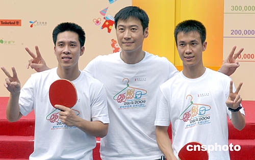 歌星黎明(中)與奧運(yùn)乒乓球男子雙打銀牌得主高禮澤(左)、李靜9月28日在香港出席「公益金便服日」突破紀(jì)錄儀式,大會(huì)并舉行乒乓球友賽,賽后黎明與香港「乒乓孖寶」合照。