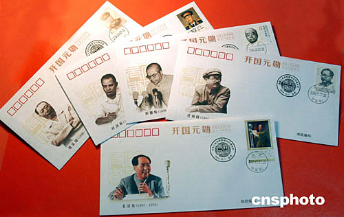 在慶祝中華人民共和國成立五十五周年之際,中國郵票博物館九月二十九日出品發(fā)行了一套十五枚《開國元勛》絹質(zhì)紀念封!堕_國元勛》絹質(zhì)紀念封其中印有毛澤東、周恩來、劉少奇、朱德、任弼時、鄧小平、陳云、彭德懷、劉伯承、賀龍、陳毅、羅榮桓、徐向前、聶榮臻、葉劍英等開國元勛的生活圖象和貼有相應(yīng)肖像郵票。這套絹質(zhì)紀念封也被收納在中國郵票博物館于當日發(fā)行的《開國元勛》金銀郵品典藏冊之中。中新社記者:鄒憲