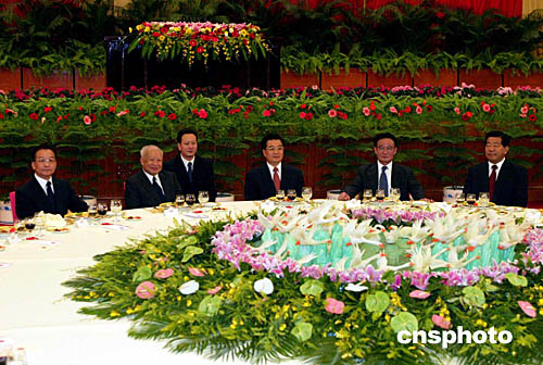 中國(guó)國(guó)家主席胡錦濤、全國(guó)人大常委會(huì)委員長(zhǎng)吳邦國(guó)、國(guó)務(wù)院總理溫家寶、全國(guó)政協(xié)主席賈慶林等與柬埔寨西哈努克國(guó)王和王后出席招待會(huì)。