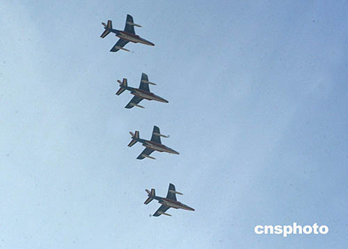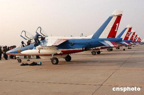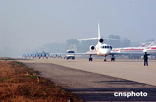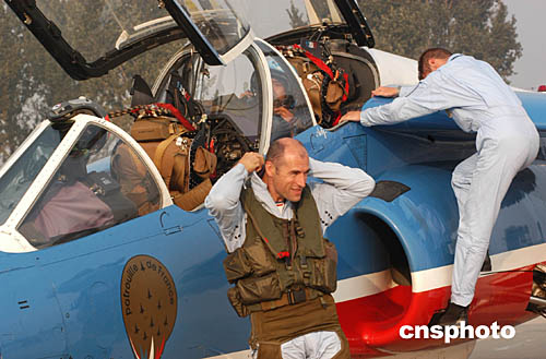 “法蘭西巡邏兵”飛行表演隊的十架阿爾法戰(zhàn)機(jī)和一架獵鷹公務(wù)機(jī),十月五日下午四點(diǎn)四十分許經(jīng)過首都國際機(jī)場轉(zhuǎn)場飛抵北京南苑機(jī)場。中新社記者:鄒憲