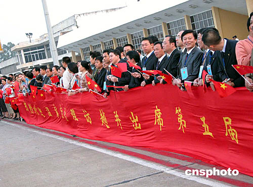十月六日傍晚,中國(guó)總理溫家寶抵達(dá)河內(nèi)開(kāi)始對(duì)越南正式訪問(wèn)。中國(guó)駐越使館工作人員、華僑、留學(xué)生手持國(guó)旗,打出橫幅熱烈歡迎溫家寶總理訪問(wèn)越南。作者:吳慶才