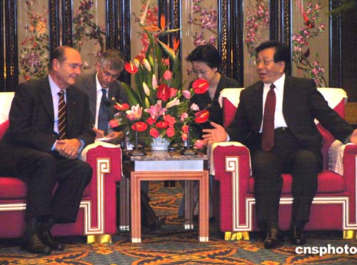 中國(guó)國(guó)家副主席曾慶紅(右)10月9日在四川成都錦江賓館會(huì)見了來華訪問的法蘭西共和國(guó)總統(tǒng)雅克·希拉克(左)一行,雙方進(jìn)行了親切友好的交談。作者:楊杰