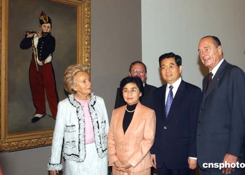 中新社北京十月十日電(記者李靜)“法國(guó)印象派珍品展”今天在中國(guó)美術(shù)館開幕,中國(guó)國(guó)家主席胡錦濤和在華訪問(wèn)的法國(guó)總統(tǒng)希拉克,以及兩國(guó)元首的夫人一道觀看了畫展,法國(guó)奧賽博物館館長(zhǎng)樂莫瓦納兼任全程解說(shuō)。