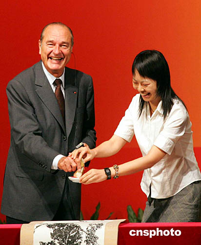 受中國國家主席胡錦濤的邀請,法國總統(tǒng)希拉克八日起對中國進行為期五天的國事訪問。在鄧小平的家鄉(xiāng)欣賞了絢爛的民族舞蹈、神奇的川劇變臉;在杜甫草堂與詩圣進行了跨越時空的交流;在北京與中國最高層領導人舉行了親切會晤,希拉克又在上海出席了中法中心的奠基儀式,并做了為時半個鐘頭的激情演講。