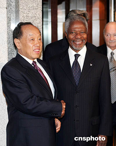 中新網(wǎng)10月11日電 據(jù)新華網(wǎng)報道,聯(lián)合國秘書長科菲·安南11日在京向中國外交部長李肇星致謝,贊賞中國維和人員在參與聯(lián)合國維和行動中表現(xiàn)出的專業(yè)精神和良好素質(zhì)。