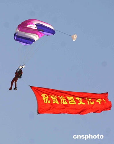 十月十一日,為祝賀法國文化年在中國舉行,中國人民解放軍空軍在法國空軍“法蘭西巡邏兵”飛行表演后,進(jìn)行了跳傘表演。圖為跳傘隊員在空中打開醒目的標(biāo)語。中新社記者:張勤