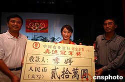 廣西自治區(qū)政府十月十一日在南寧舉行慶功會,獎(jiǎng)給第二十八屆奧運(yùn)會女子十米雙人跳臺冠軍李婷三十萬元人民幣。桂林一家企業(yè)獎(jiǎng)給李婷二十萬元人民幣和一套價(jià)值百萬元人民幣的別墅。廣西另一名獲得獎(jiǎng)牌的運(yùn)動(dòng)員周密也獲得政府獎(jiǎng)勵(lì)十萬元人民幣。作者:蔣雪林