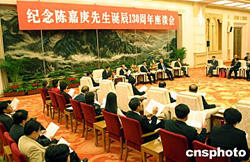 十月十二日,《紀(jì)念陳嘉庚先生誕辰130周年座談會(huì)》在北京人民大會(huì)堂舉行。與會(huì)者同陳嘉庚先生的親屬懷著崇敬心情,共同緬懷愛國(guó)僑領(lǐng)陳嘉庚先生。中新社記者:史利
