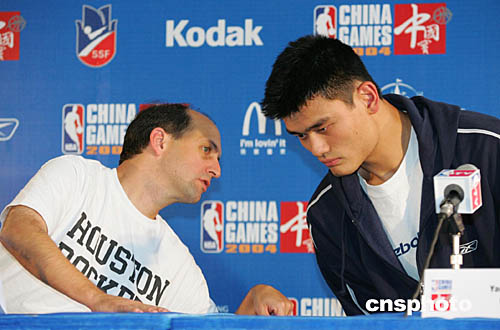 圖為在新聞發(fā)布會上,范甘迪不時與姚明“竊竊私語”進行交流。