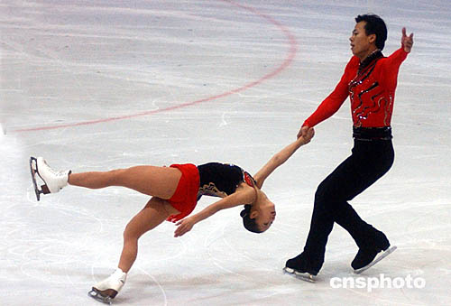 十月十三日,中國(guó)花樣滑冰隊(duì)在北京首都體育館進(jìn)行隊(duì)內(nèi)測(cè)試,備戰(zhàn)即將舉行的世界花樣滑冰大獎(jiǎng)賽美國(guó)站比賽。圖為中國(guó)花樣滑名將申雪、趙宏博演繹自由滑新編曲目《宋氏王朝》。中新社記者:武仲林