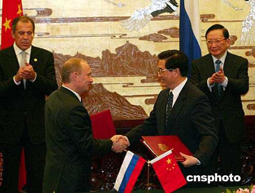 普京完全贊同胡錦濤的看法和建議,他說(shuō),發(fā)展俄中合作是俄一貫政策。《俄中睦鄰友好合作條約》為兩國(guó)關(guān)系發(fā)展奠定了重要基礎(chǔ),雙方解決邊境問(wèn)題、就俄加入世貿(mào)組織達(dá)成協(xié)議是兩國(guó)戰(zhàn)略協(xié)作伙伴關(guān)系的體現(xiàn)。我們?cè)概c中方切實(shí)落實(shí)該條約的實(shí)施綱要,推動(dòng)雙方在各領(lǐng)域的合作。俄方希望加強(qiáng)經(jīng)貿(mào)合作,爭(zhēng)取在數(shù)量和質(zhì)量上均不斷提高。他重申,俄方關(guān)于同中國(guó)的能源合作的決定始終未變,也愿同中國(guó)加強(qiáng)在科技、人文等領(lǐng)域的合作。