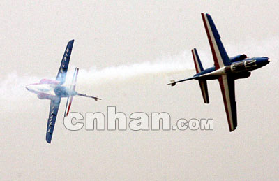 果然,經(jīng)過十多分鐘平淡無(wú)奇的單飛后,1號(hào)飛機(jī)著陸了,7號(hào)、8號(hào)飛機(jī)相繼升空。3時(shí)38分,兩架飛機(jī)做了當(dāng)天最驚險(xiǎn)也是惟一驚險(xiǎn)的動(dòng)作——對(duì)飛閃避:兩架飛機(jī)南北相向飛行,當(dāng)距離20米左右時(shí),兩機(jī)各向外側(cè)翻轉(zhuǎn)90度,兩機(jī)擦身而過,藍(lán)色和紅色的尾煙在天空劃出一道美麗的弧線?吹降挠^眾一片驚呼,沒看到的大失所望。10分鐘后,表演順利結(jié)束。