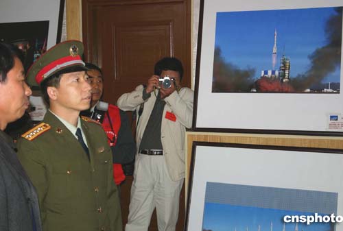 楊利偉在酒泉觀看中國(guó)首次載人航天飛行攝影展。中新社記者:孫自法