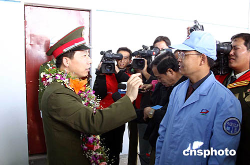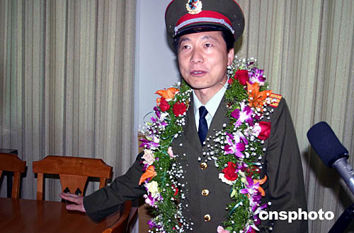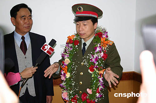 圖為楊利偉抵達(dá)航天員公寓時(shí)受到熱列歡迎。中新社記者:孫自法